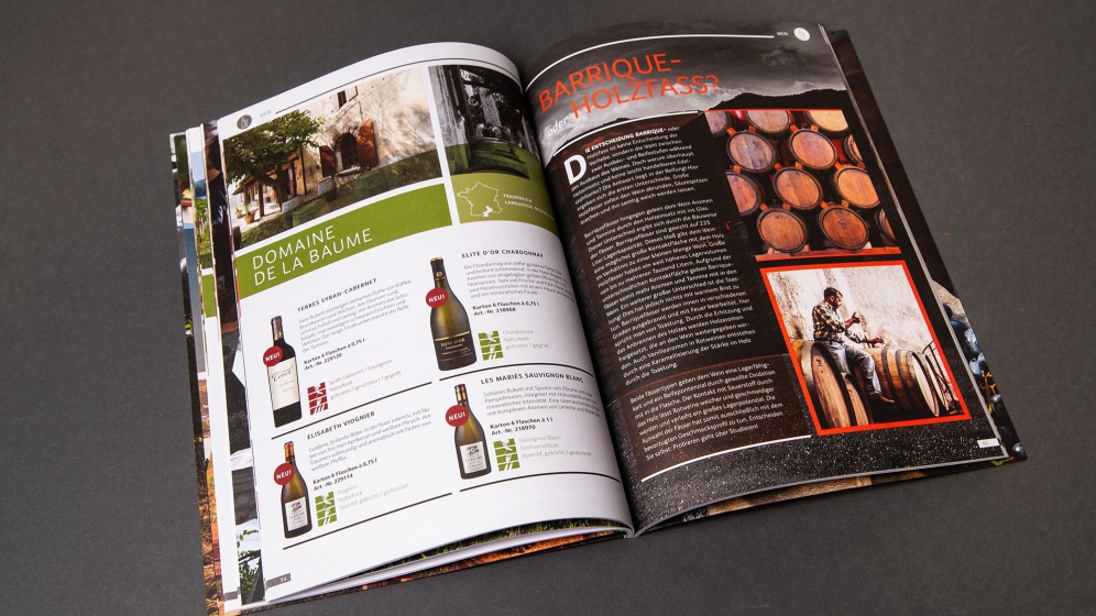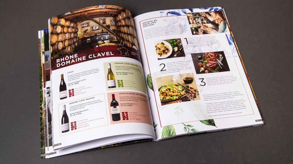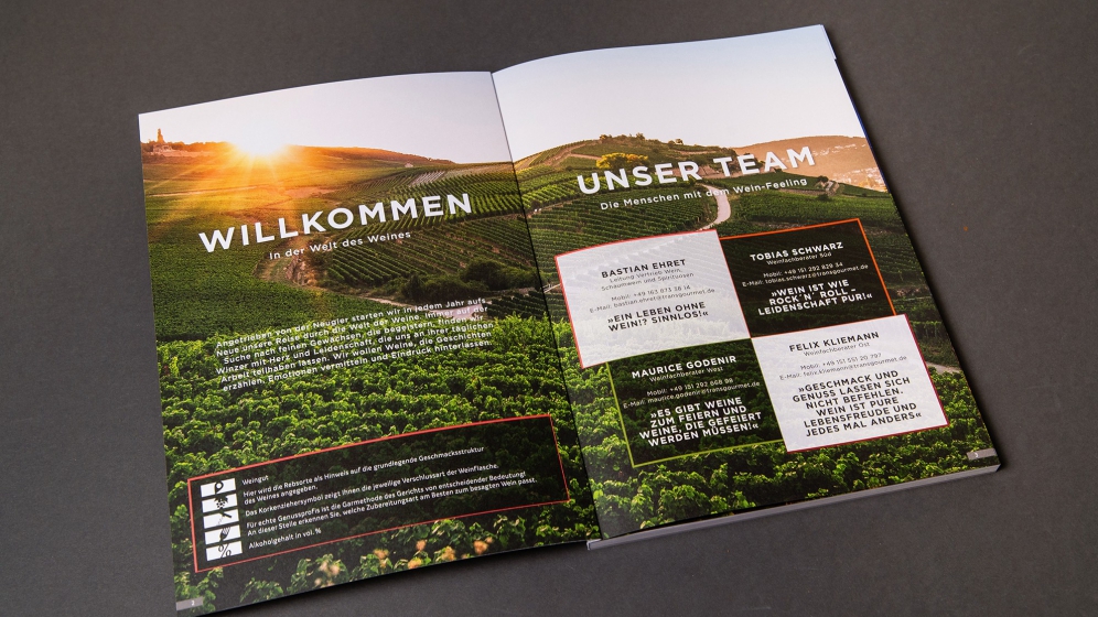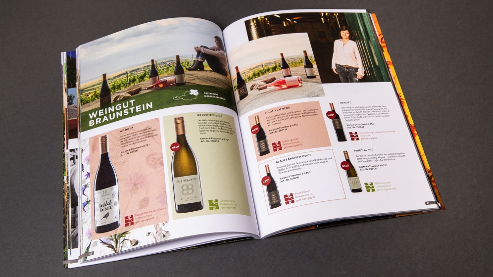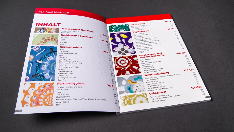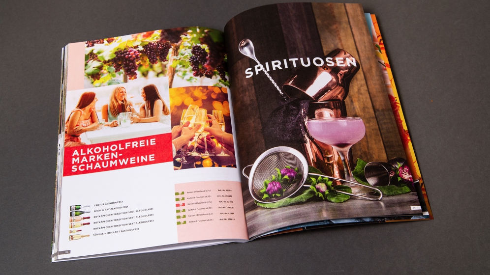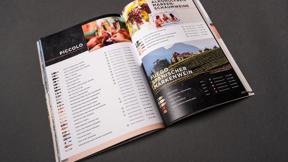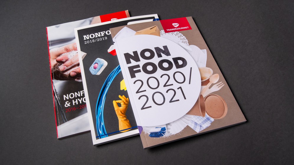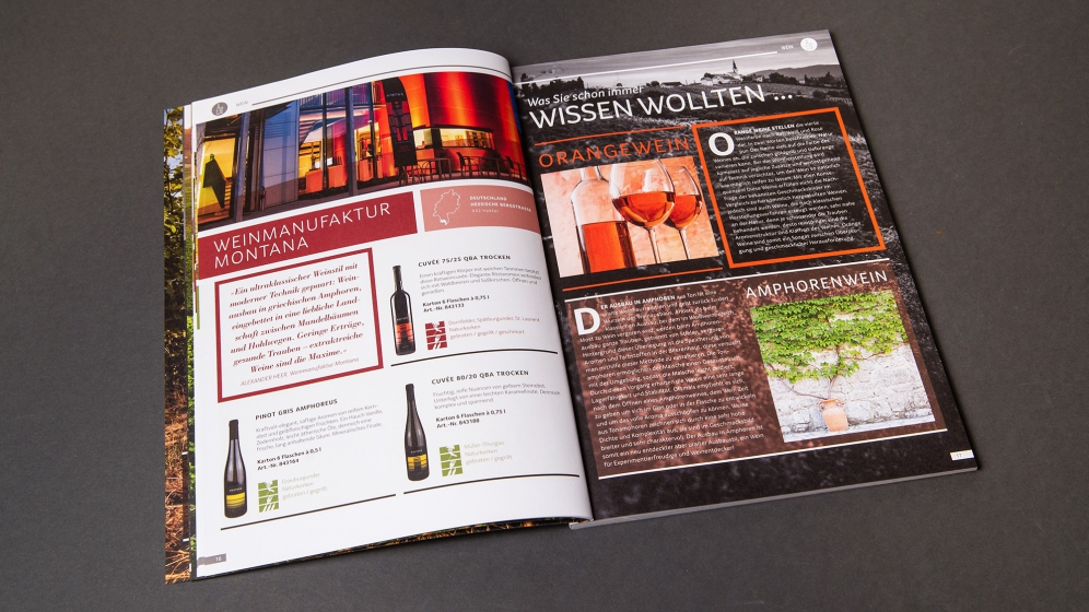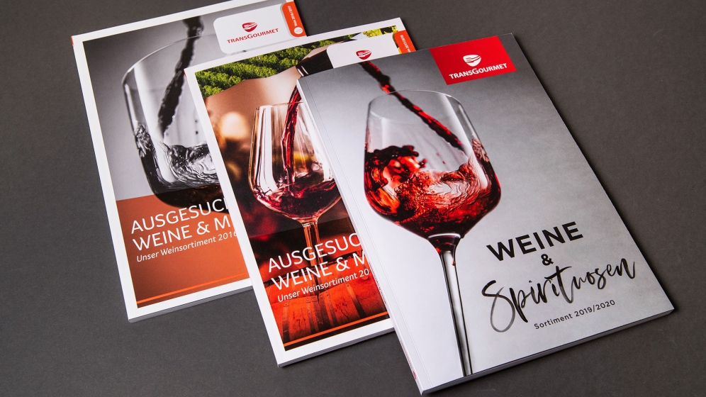 The first cooperation with me and Transgourmet was on the Non-Food 2016 catalog and quickly spread to the wine catalog in the following year. Since then I have produced two Non-Food and three wine catalogs. Every new version was a big step up the ladder in the design. Every catalog has 96–136 pages. Wine is printed on a lovely offset paper with a solid paper weight while Non-Food is printed on coated paper.