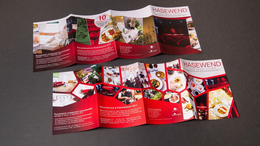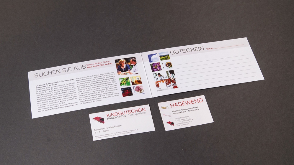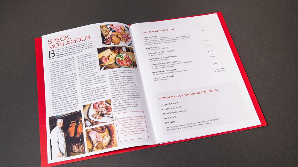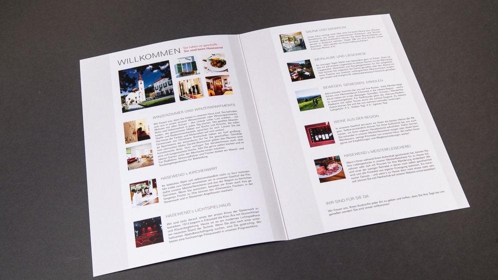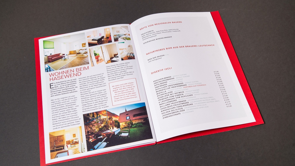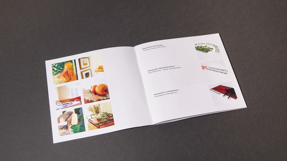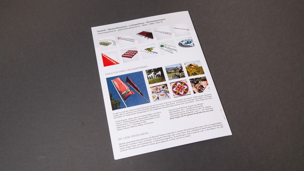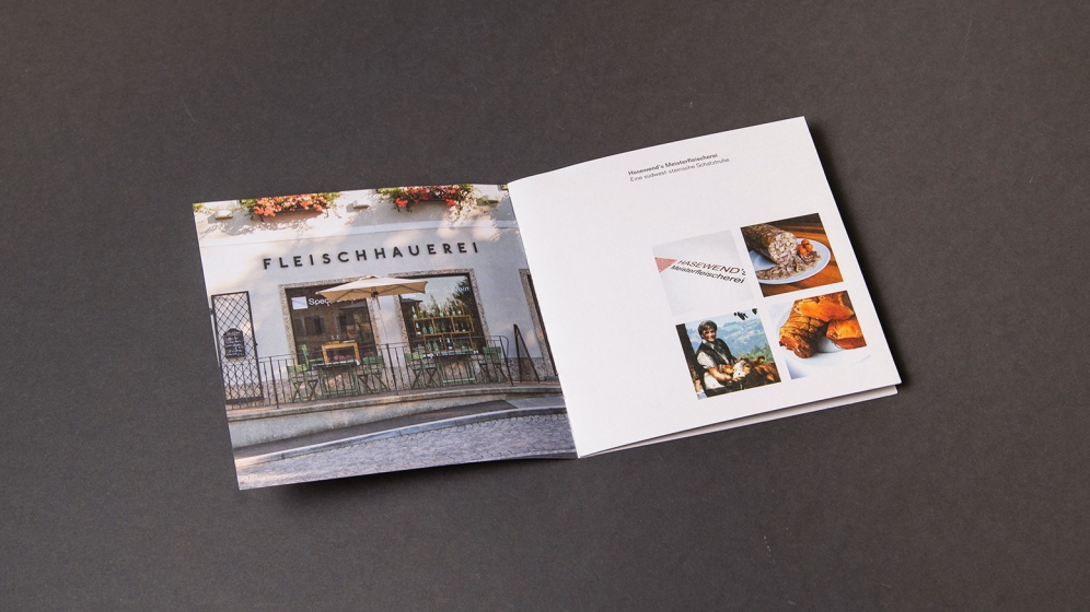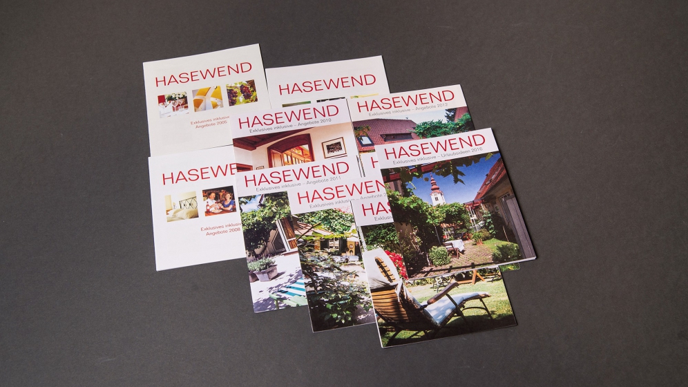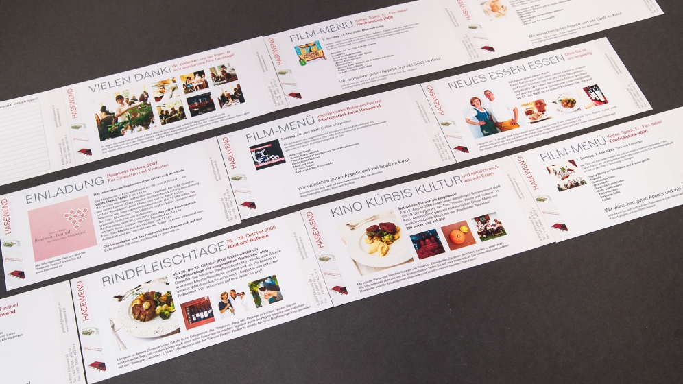 This is a small collection of samples from the print products produced for Hasewend's Kirchenwirt through the years. The new corporate identity was developed 2005 with the new company brochure and the annual catalog. A few months later, I produced the new website, which has been enhanced with several features like a webshop for products from the butchery. These printed matters include several brochures, annual catalogs, menue cards, bonus cards, coupons and business cards.